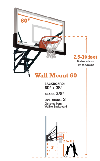 The PROformance Hoops WM60 Wall-Mount Adjustable Basketball Hoop features a 60- inch glass basketball backboard, a Heavy Duty flex rim, and a 3 foot extension from the wall to the front of the backboard. With a simple turn of the height adjustment handle, the patented external Height Adjustment Mechanism easily adjusts the height of the basketball hoop from 7′ to 10′. With its rugged structural steel construction, the WM60 Wall Mount Basketball Goal is perfect for anyone looking for a wall mounted basketball system with the durability, rigidity and play of an in-ground basketball hoop.